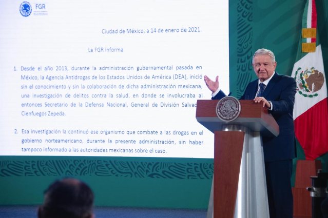 Ciudad de México, 15 de enero de 2021.- La exoneración del general Salvador Cienfuegos Zepeda es un asunto que correspondió a la Fiscalía General de la República (FGR) y el gobierno que represento la avala, afirmó el presidente Andrés Manuel López Obrador.
