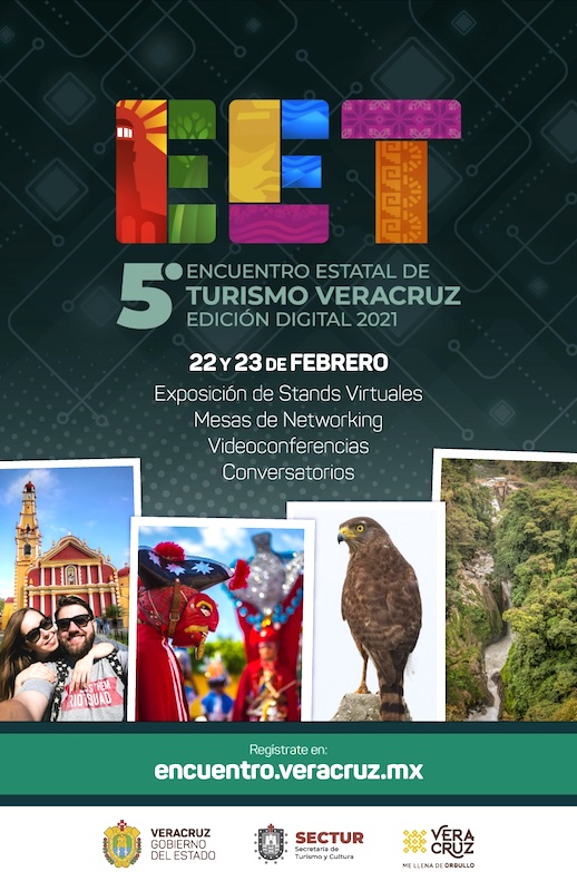 Xalapa, Ver., 16 de febrero de 2021.- La Secretaría de Turismo y Cultura (SECTUR) invita al 5º Encuentro Estatal de Turismo Veracruz Edición Digital 2021, con especialización en los segmentos de naturaleza y romance, los días 22 y 23 de febrero a través de las redes sociales de la dependencia.