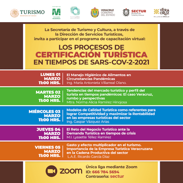Durante todo marzo la dependencia estatal ofrecerá 24 cursos gratuitos, apostándole a la integración de aspectos prioritarios a fin de que el turista se quede más tiempo en Veracruz; en tanto, los panelistas son expertos acreditados por el Gobierno de México.