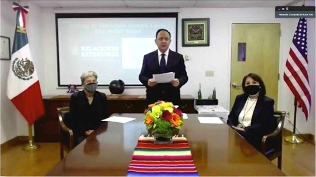 En la transmisión en vivo, y desde la sede del consulado de México en Nueva York, la galardonada recibió de manos del titular de esa dependencia diplomática, Jorge Islas López, la medalla y el pergamino que acreditaron el otorgamiento del grado de Doctora Honoris Causa por la UV.