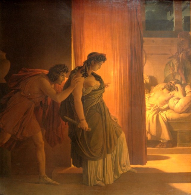 Orestes y Electra para llevar a cabo su propósito planearon muy bien el proyecto, el momento cumbre se logra dar en el palacio donde viven los amantes, Egisto es asesinado por Orestes y entre gritos y lamentos aparece Clitemnestra frente a su hijo Orestes, este le dice a su madre que viene a vengar la infame muerte que le ocasionó a su padre, ella le responde a su hijo que se contenga, Orestes duda y le pregunta a su amigo Pílades qué debe hacer, mientras Orestes se decide su madre le exclama:
