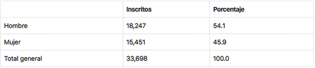 Respecto a su clasificación por género 18 mil 247 personas registradas son hombres y 15 mil 451 son mujeres, equivalentes al 54 y 45 por ciento del total de registros, respectivamente.