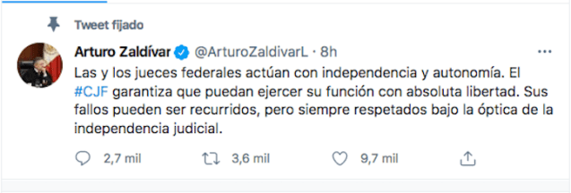 A través de su cuenta de Twitter, señaló: ”las y los jueces federales actúan con independencia y autonomía. El #CJF garantiza que puedan ejercer su función con absoluta libertad. Sus fallos pueden ser recurridos, pero siempre respetados bajo la óptica de la independencia judicial”.