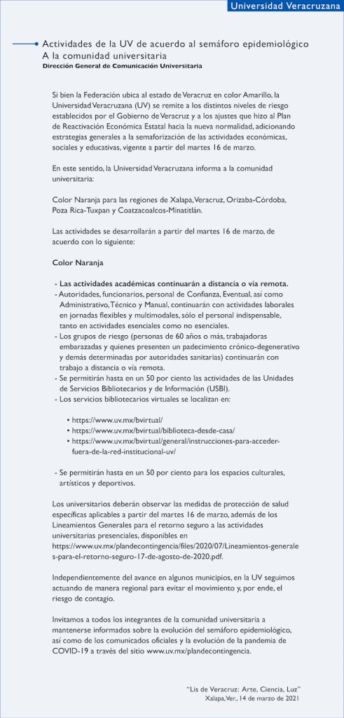Xalapa, Ver., 14 de marzo de 2021.- A través de un comunicado, la Universidad Veracruzana, señala: