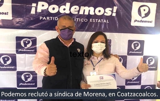 En el otro extremo del Estado, ayer Francisco “Paco” Garrido, de Podemos, reclutó para sus filas a la síndica del ayuntamiento de Coatzacoalcos, Yazmín Martínez Irigoyen, a quien entregó su nombramiento como delegada especial del Comité Central Ejecutivo en ese municipio.