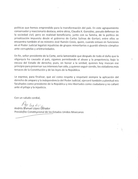 Además, señalo, al empresario Claudio X. González y al ministro en retiro José Ramón Cossío de estar detrás de dicho amparo; y formar parte de un buró destinado a “oponerse a las obras, acciones y políticas que hemos emprendido para la transformación del país”.