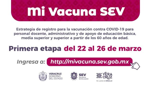 Xalapa, Ver., 22 de marzo de 2021.- En seguimiento a la estrategia federal de vacunación contra el coronavirus, a partir de las 13:00 horas de este lunes la Secretaría de Educación de Veracruz (SEV) habilitó la plataforma http://mivacuna.sev.gob.mx, para el registro de trabajadores de 60 años y más.