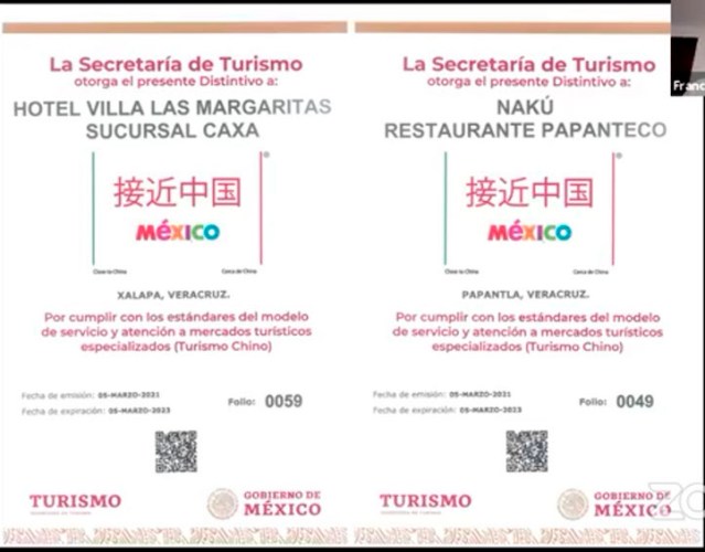 Xalapa, Ver., 26 de marzo de 2021.- A nivel nacional, Veracruz figura como el estado que más sellos “Cerca de China” ha obtenido; éstos van dirigidos a hoteles, agencias de viajes, restaurantes, guías de turistas y centros de convenciones que desarrollaron y mantienen esfuerzos relacionados con el primer contacto y servicio, instalaciones, protocolo de atención y hospitalidad; además de comercialización con el país oriental.