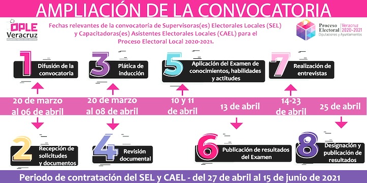 Xalapa, Ver., 30 de marzo de 2021. Con la finalidad de captar un mayor número de aspirantes, el Consejo General del Organismo Público Local Electoral del Estado de Veracruz (OPLE), aprobó la extensión de plazos de las actividades de reclutamiento y selección de Supervisoras/es Electorales Locales (SEL) y Capacitadoras/es Asistentes Electorales Locales (CAEL), para el Proceso Electoral Local Ordinario 2020-2021.