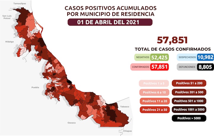 Xalapa, Ver., 01 de abril de 2021.- En seguimiento al panorama del coronavirus (COVID-19), la Secretaría de Salud (SS) informa que, al corte de las 19:00 horas, los casos confirmados acumulados de COVID-19 son 57 mil 851 (+ 96 nuevos) en la entidad.
