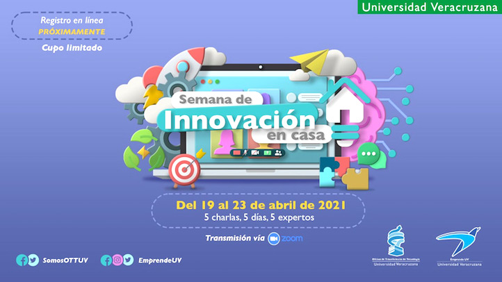 Xalapa, Ver., 18 de abril de 2021.-La Dirección General de Vinculación de la Universidad Veracruzana (UV), a través de la Oficina de Transferencia de Tecnología (OTT) y el Departamento de Desarrollo Emprendedor e Innovación (Emprende UV), realizará la Semana de Innovación en Casa 2021, del 19 al 23 de abril y de 16:00 a 17:30 horas, a través de Zoom y las páginas @SomosOTTUV y @EmprendeUV de Facebook.