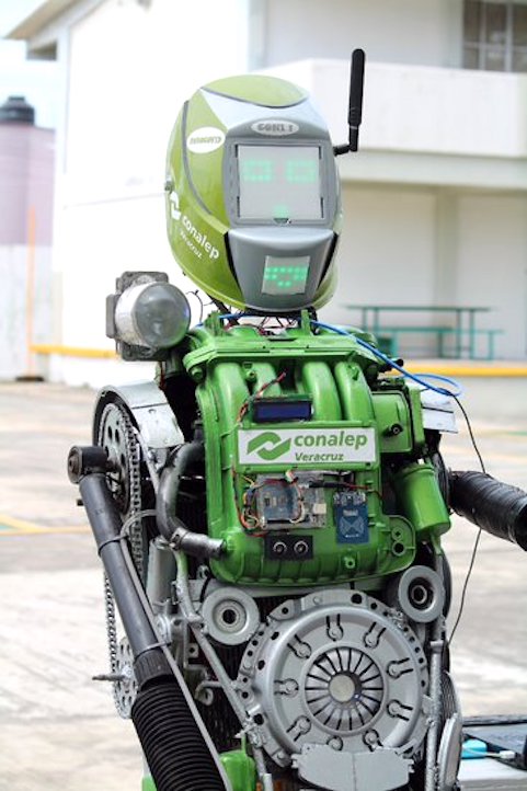 Para darle forma al robot, los alumnos consiguieron piezas de desecho en un taller mecánico, como balatas, amortiguadores para piernas y una careta para los gestos. Al robot se le colocaron decoraciones como las luces de los neo-pixeles y un sensor de distancia que va a activarse cada vez que una persona esté enfrente de él.