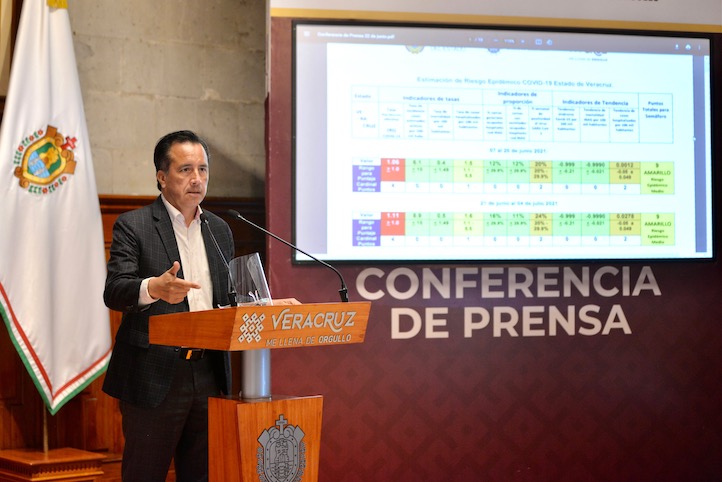 Xalapa, Ver., 22 de junio de 2021.- Del 21 de junio al 04 de julio Veracruz se mantendrá en amarillo del Semáforo Epidemiológico nacional, con 9 puntos en la escala de riesgo y sólo a uno de regresar al verde, por lo que el gobernador Cuitláhuac García Jiménez manifestó el llamado en esta Semana Estatal Preventiva por COVID-19: No hagas olas, evita la tercera.