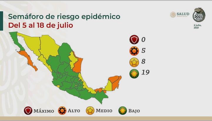 Ciudad de México, 02 de julio de 2021.- Del 5 al 18 de julio, 19 entidades permanecerán en color verde del Semáforo de Riesgo Epidémico, mientras que ocho estarán en color amarillo y cinco en anaranjado, informa la Secretaría de Salud, esto a pesar de incremento de casos en varios estados.