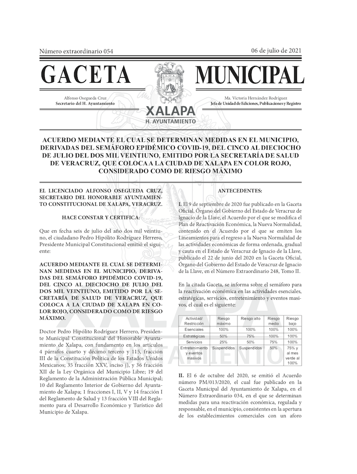 Xalapa, Ver., 07 de julio de 2021.- Para privilegiar el cuidado de la salud y reducir la velocidad de contagio del Coronavirus SARS-CoV-2, el Ayuntamiento emitió la Gaceta Municipal Extraordinaria 054, en la que se establecen diversas medidas sanitarias necesarias ante el semáforo de riesgo epidemiológico que coloca a Xalapa en color rojo, de riesgo máximo, entre los días 5 y 18 de julio del presente año.