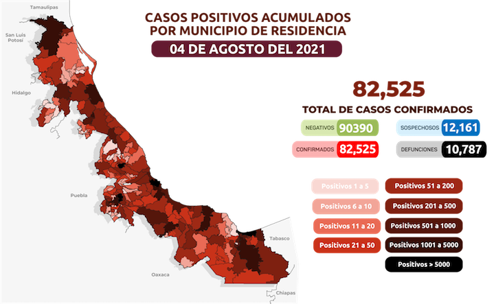 Xalapa, Ver., 04 de agosto de 2021.- Al corte de las 19:00 horas, la Secretaría de Salud (SS) reporta que son 82 mil 525 (+ 895 nuevos) los casos confirmados de COVID-19 en la entidad, de 185 mil 76 eventos analizados.