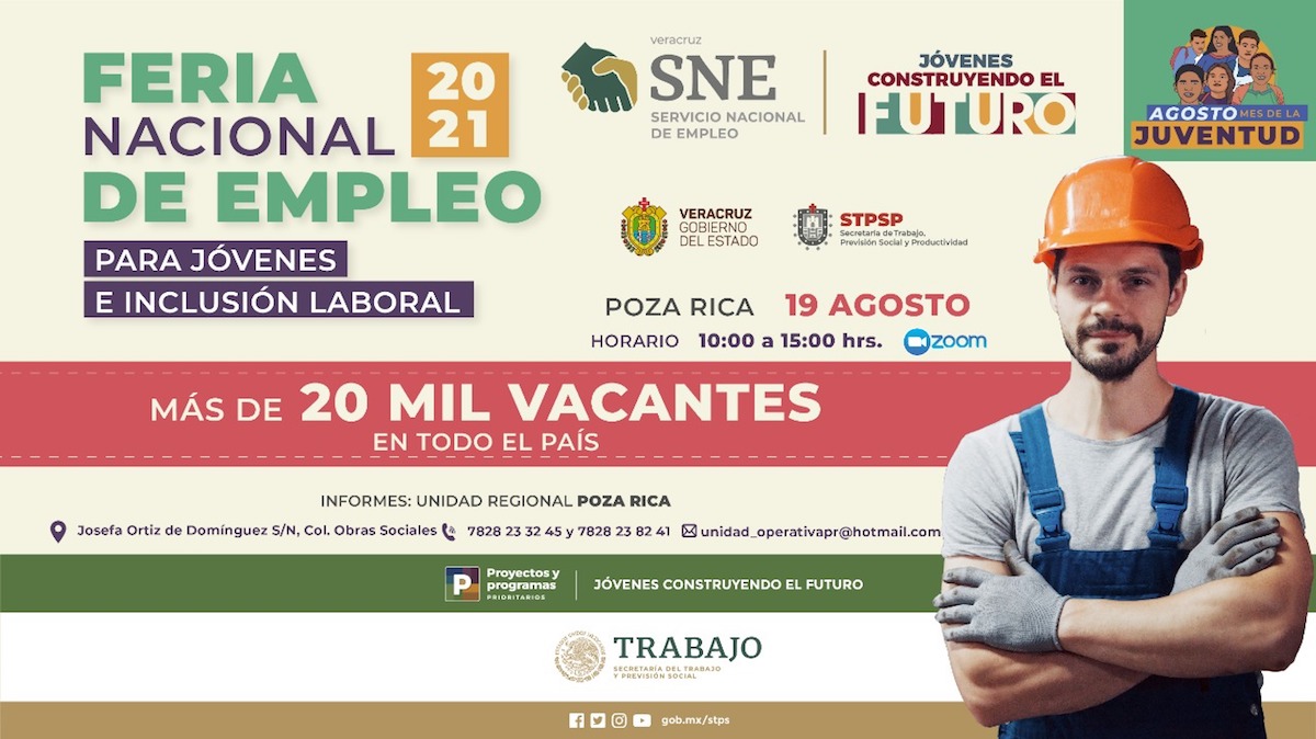 Xalapa, Ver., 18 de agosto de 2021.- La Secretaría de Trabajo, Previsión Social y Productividad (STPSP), a través del Servicio Nacional de Empleo (SNE) Veracruz, invita a la Feria Nacional de Empleo para Jóvenes e Inclusión Laboral que tendrá efecto en diferentes fechas y sedes virtuales con 20 mil vacantes en todo el país.