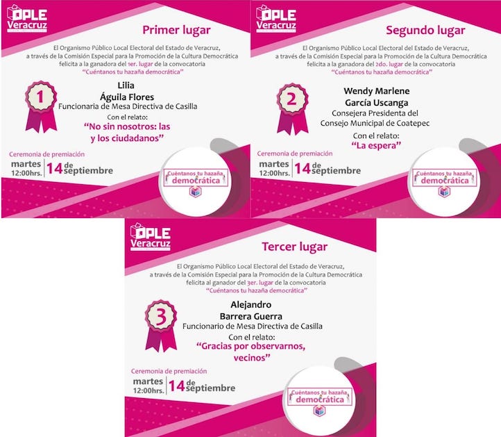 Agregó que lograron ofrecer a Veracruz la democracia que merece y que la misma ciudadanía exige: “Ese era el principal motivo y seguirá siendo, también por supuesto la principal meta en esta iniciativa es dar a conocer a la sociedad veracruzana que dentro de ella existen ciudadanas y ciudadanos siempre dispuestos a garantizar las libertades democráticas de todas y todos, por ello el OPLE Veracruz les agradece el trabajo realizado a Lilia Águila Flores, del municipio de Río Blanco; a Wendy Marlene García Uscanga, del municipio de Coatepec, y a Alejandro Barrera Guerra, del municipio de Xalapa, ganadores de la convocatoria: “Cuéntanos tu Hazaña Democrática”.