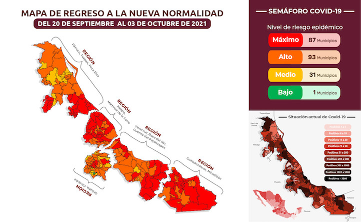 Del 20 de septiembre al 03 de octubre Veracruz estará en amarillo (riesgo medio) del indicador epidémico de la Federación; a nivel estatal queda de la siguiente manera: