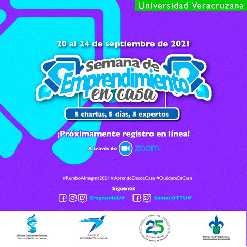 Xalapa, Ver., 18 de septiembre de 2021.- La Universidad Veracruzana (UV), a través de la Dirección General de Vinculación (DGV), la Oficina de Transferencia de Tecnología (OTT) y el Departamento de Desarrollo Emprendedor, invitan a la comunidad universitaria y al público en general a atender las conferencias virtuales de la Segunda Semana de Emprendimiento en Casa, que inicia el lunes 20 de septiembre en punto de las 17:00 horas.