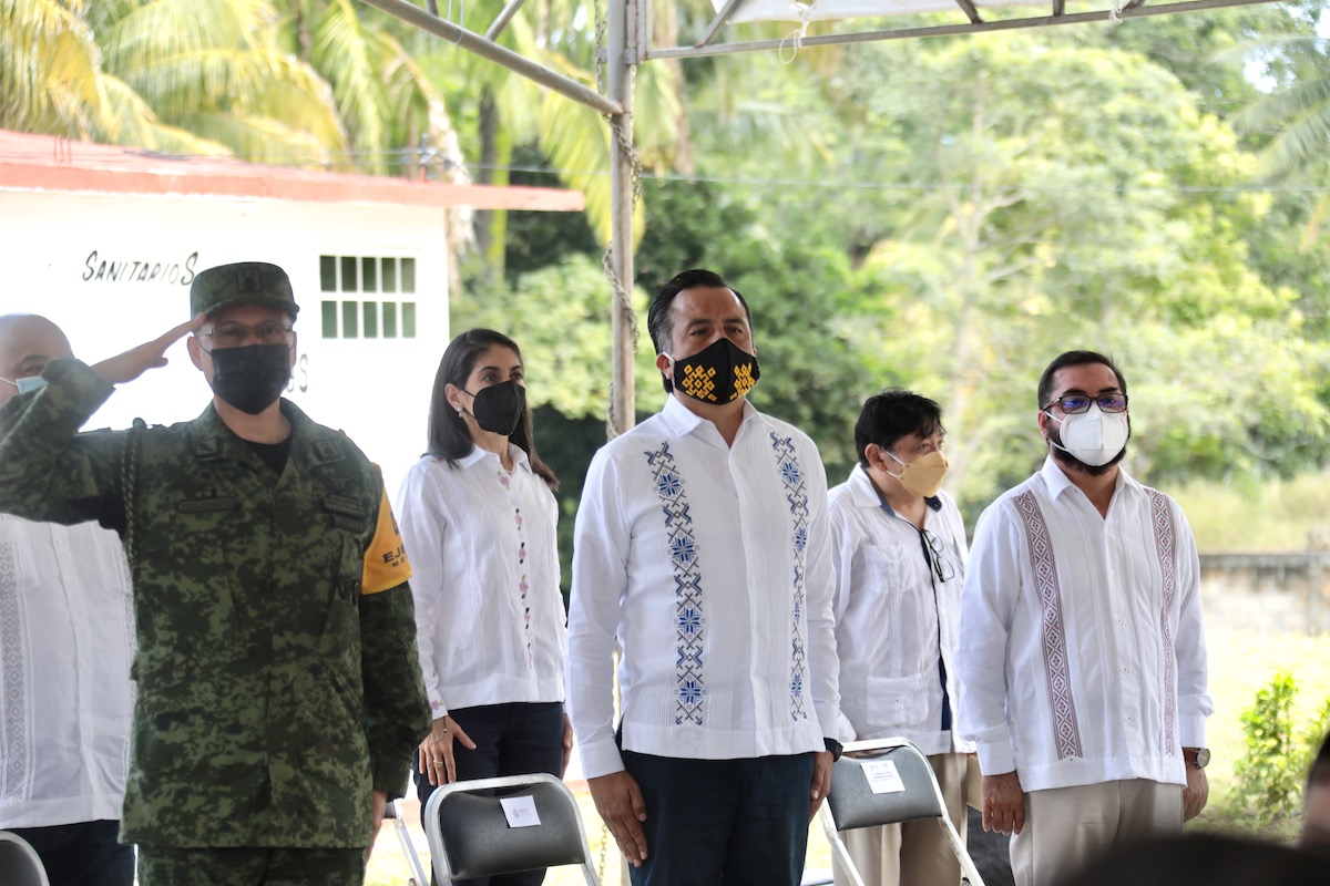 Lo acompañaron el comandante de la 29/a Zona Militar, General Fernando Colchado Gómez; representante de la Tercera Zona Naval, Contralmirante Fidel Maldonado López; el secretario de Gobierno Eric Cisneros Burgos; la fiscal general del Estado, Verónica Hernández Giadáns; el director de la Primaria, César Alberto Castillo Torres; y los alcaldes saliente y electo de Agua Dulce, Sergio Guzmán Ricárdez y José Noé Castillo Olvera.