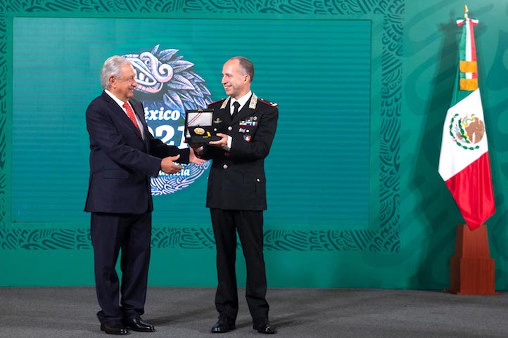 Más tarde, el primer mandatario y el secretario de Relaciones Exteriores, Marcelo Ebrard Casaubon, entregaron la condecoración de la Orden Mexicana del Águila Azteca al Comandante de los Carabineros para la protección del Patrimonio Cultural de Italia, Roberto Riccardi.
