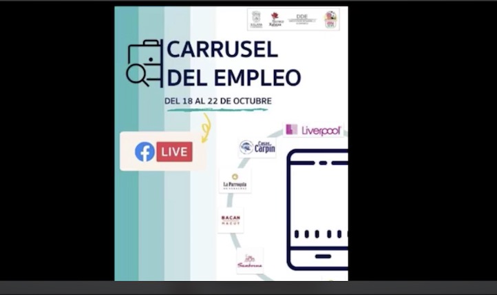 Detalló que el Carrusel del empleo se desarrollará del lunes 18 al viernes 22 de octubre de 10:00 a 14:00 horas, y quienes quieran participar podrán acceder a las transmisiones en vivo del evento a través del Facebook de la Dirección de Desarrollo Económico o bien el link direcciondedesarrolloeconomico_empleo. Además, se podrá ver transmisiones grabadas mediante el canal Youtube de la dependencia.