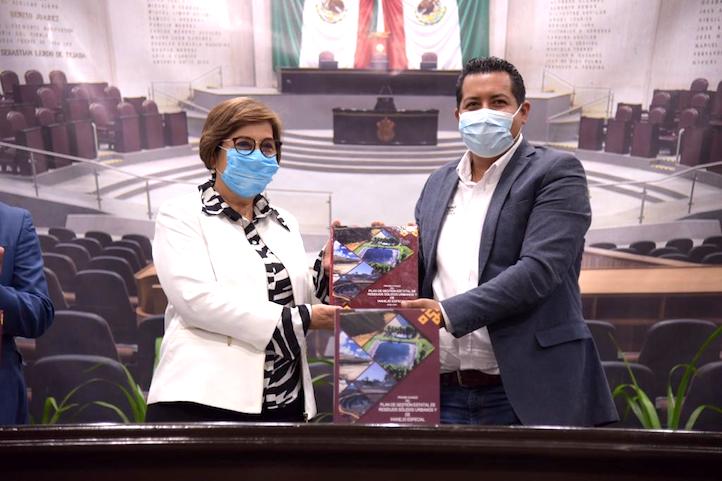 Durante el acto protocolario de entrega del documento, celebrado en el auditorio Sebastián Lerdo de Tejada del Palacio Legislativo, la Diputada dijo que este Plan será la herramienta que permitirá a las autoridades municipales implementar un manejo integral de los residuos sólidos urbanos y de manejo especial.