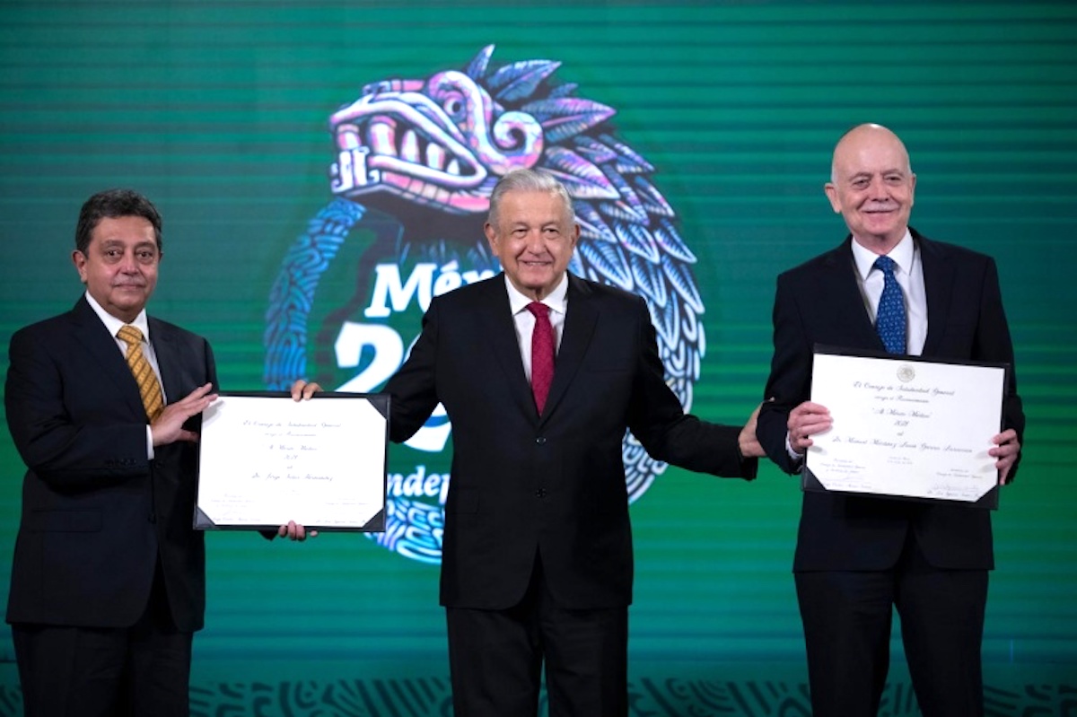 Durante la conferencia mañanera, el presidente otorgó el Reconocimiento al Mérito Médico 2021 a Jorge Salas Hernández y Manuel Martínez Lavín García Lascuráin por su vocación de servicio y entrega en favor de la medicina.