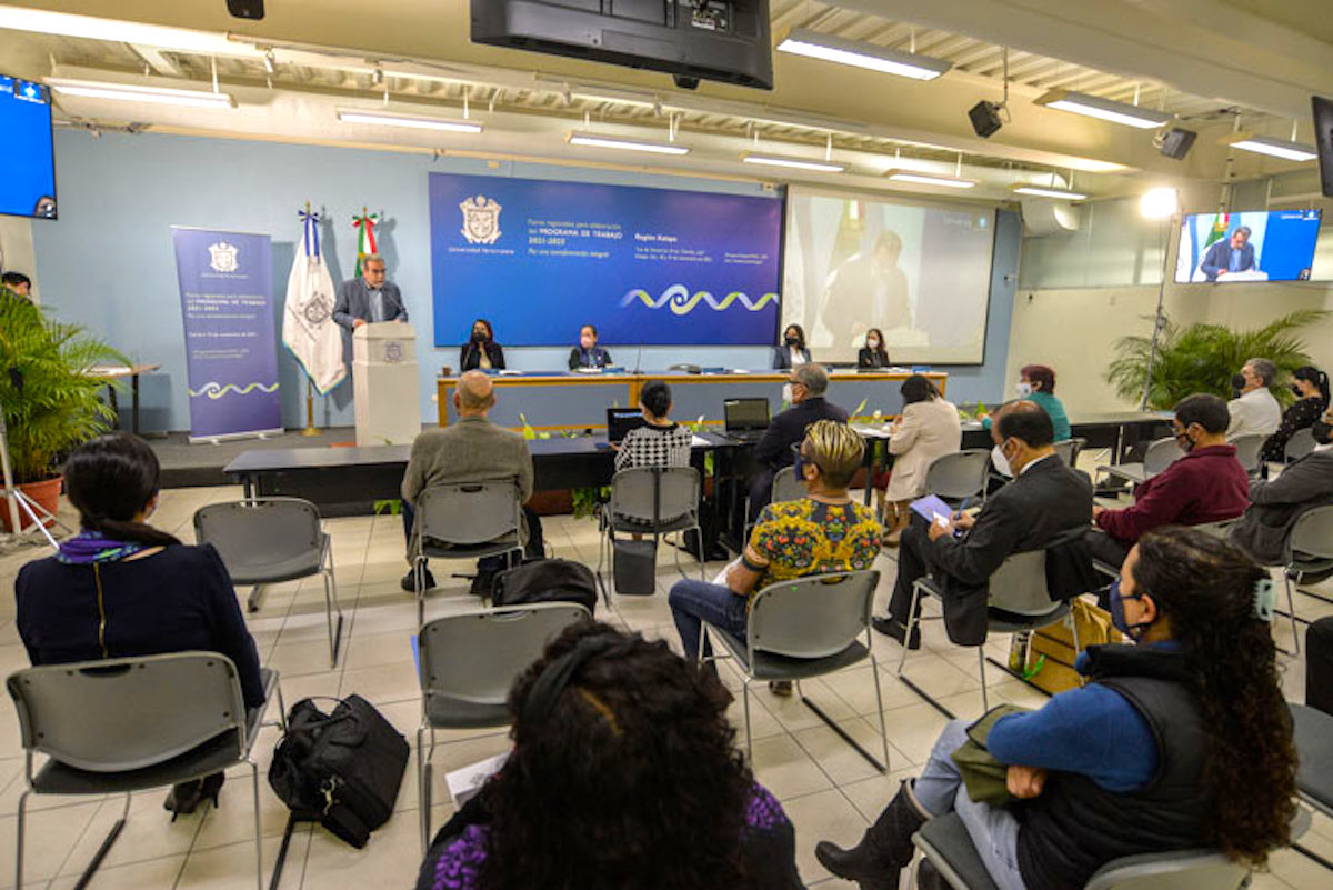 Xalapa, Ver., 18 de noviembre de 2021.- En la sesión inaugural del Foro Regional para elaboración del Programa de Trabajo 2021-2025 en Xalapa, celebrada de manera presencial y virtual desde la Unidad de Servicios Bibliotecarios y de Información (USBI), se ratificó lo sucedido en las cuatro regiones: es un ejercicio democrático, con apertura de espacios incluyentes y de aportación comprometida y corresponsable.