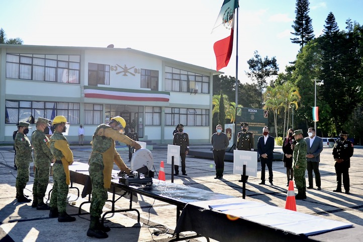 Emiliano Zapata, Ver., 22 de noviembre de 2021.- Con la presencia del gobernador Cuitláhuac García Jiménez, la Secretaría de la Defensa Nacional (SEDENA) llevó a cabo la inutilización de 710 armas de fuego decomisadas, que habían sido empleadas en actos ilícitos, refrendando así el compromiso de coadyuvar a la construcción de un país más seguro y en paz.