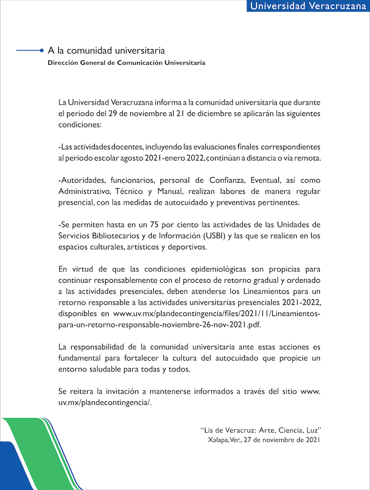 Xalapa, Ver., 27 de noviembre de 2021.- A través de un comunicado, la Universidad Veracruzana, señala: