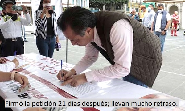 Mientras andaba en lo que a él le interesa, en Minatitlán el mismo día a temprana hora aparecía en un módulo el diputado federal Sergio Gutiérrez Luna, presidente de la Mesa Directiva de la Cámara de Diputados, “como ciudadano” porque, publicó en su cuenta de Facebook, sus paisanos de esa ciudad del sur de Veracruz lo habían invitado a ser el primer veracruzano en firmar la petición para la consulta de revocación de mandato del presidente Andrés Manuel López Obrador. El gobernador no lo haría sino hasta el 21 de noviembre al medio día en el módulo que se instaló en la Plaza Lerdo.