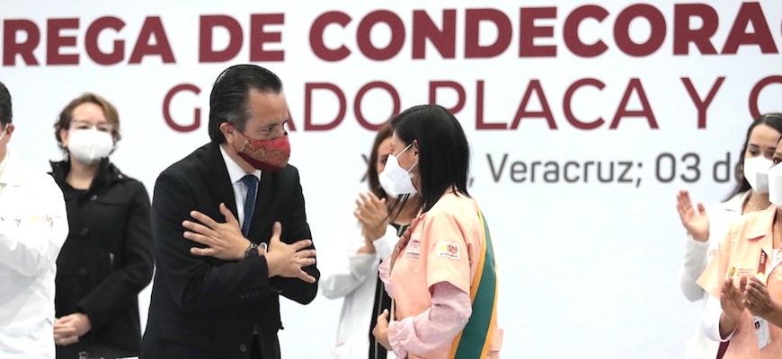 Xalapa, Ver., 03 de diciembre de 2021.- Al otorgar la Condecoración Miguel Hidalgo en los grados Placa y Banda al personal de salud, el gobernador Cuitláhuac García Jiménez exaltó la encomiable labor de quienes han salvado vidas durante le emergencia sanitaria por COVID-19; “estamos eternamente agradecidos por el gran trabajo realizado”. Señaló que mediante el esfuerzo hicieron comprender a todos la forma heroica con que … Continúa leyendo Entrega Gobernador Condecoración Miguel Hidalgo a personal de salud que estuvo en la primera línea durante la pandemia