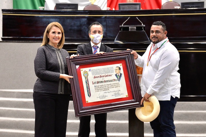 Xalapa, Ver., 03 de diciembre de 2021.- Por su impulso a la creación de un centro cultural en la ribera del río Tonto –que une los pueblos de Veracruz y Oaxaca en la región Papaloapan–, la LXVI Legislatura determinó otorgar la Medalla y Diploma “Adolfo Ruiz Cortines” a Luis Antonio Rodríguez Pulido, en evento encabezado por los titulares de los Tres Poderes en Veracruz.