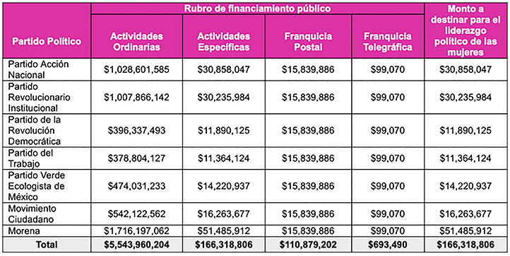 Con base en la Constitución y la Ley General de los Partidos Políticos, el sostenimiento de actividades ordinarias permanentes será de 5 mil 543 millones 960 mil 204 pesos, el cual se distribuirá en un 70%, equivalente a 3 mil 880 millones 772 mil 146 pesos, según el porcentaje de votación nacional emitida obtenido en la elección de diputados por el principio de Mayoría Relativa y el otro 30% de forma igualitaria.