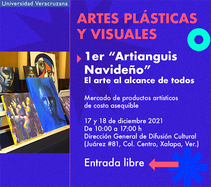 Xalapa, Ver., 14 de diciembre de 2021.- La Dirección General de Difusión Cultural de la Universidad Veracruzana (UV) llevará a cabo el 1er Artianguis Navideño “El arte al alcance de todos”, el viernes 17 y sábado 18 de diciembre, donde las personas podrán vender sus productos a costos accesibles.