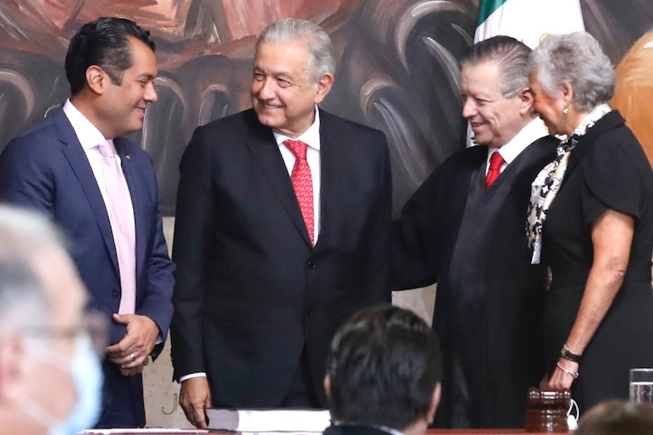 Previo a la ceremonia, el legislador minatitleco intercambió animosos comentarios con el presidente López Obrador, la senadora Sánchez Cordero, así como con el ministro Arturo Saldívar.