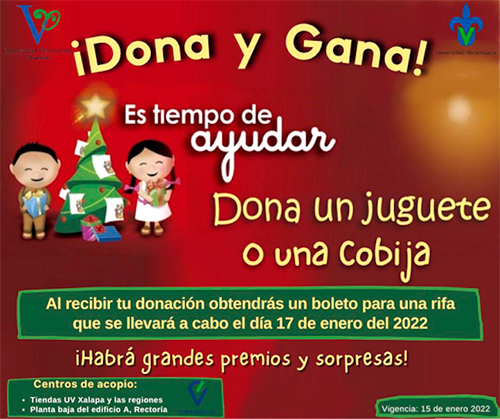 Los centros de acopio de la iniciativa “Dona un juguete” se localizan en la planta baja del edificio A de la Unidad Central de la UV y en la entrada del Gimnasio “Miguel Ríos Torres”; las donaciones se reciben hasta el 21 de diciembre y continuarán del 5 al 14 de enero, de lunes a viernes de 10:00 a 15:00 horas.