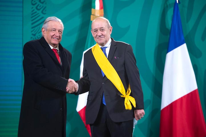 En conferencia de prensa matutina el mandatario otorgó la condecoración de la Orden Mexicana del Águila Azteca al ministro de Asuntos Exteriores de Francia, Jean-Yves Le Drian, “por su desempeño en favor de la política exterior y en especial por su trato amistoso, fraterno, con el gobierno de México y con nuestro pueblo”.