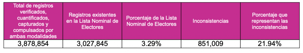 Ciudad de México, 21 de enero de 2022.- La Comisión del Registro Federal de Electores del Instituto Nacional Electoral (INE) aprobó por unanimidad el Informe preliminar sobre el proceso de verificación del porcentaje de firmas de apoyo de la ciudadanía requeridas para la Revocación de Mandato y su identificación en la Lista Nominal de Electores que, con corte al 19 de enero, da cuenta de los siguientes resultados: