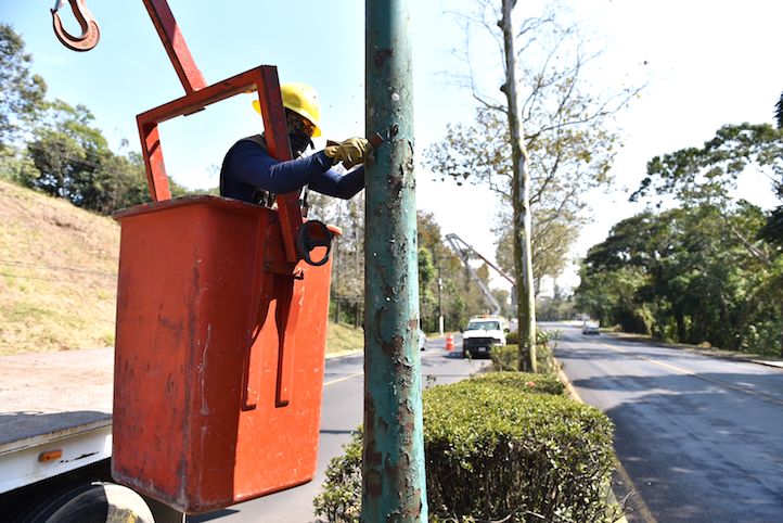 La encargada de la dependencia, Teresa Juárez Mejía, explicó que como parte de estas labores, este jueves se continuó con el mantenimiento de postes metálicos ubicados en la avenida Rafael Murillo Vidal con Circuito Presidentes.