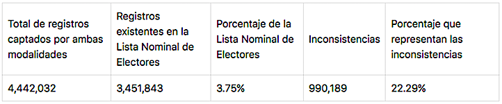 Córdova Vianello explicó que de los 11.1 millones de firmas susceptibles de ser verificadas y cuantificadas se logró verificar casi el 40%, de las cuales 990 mil 189 presentaron alguna inconsistencia en ambas modalidades, lo cual representa el 22% de los apoyos recabados tanto a través de la App como en papel.
