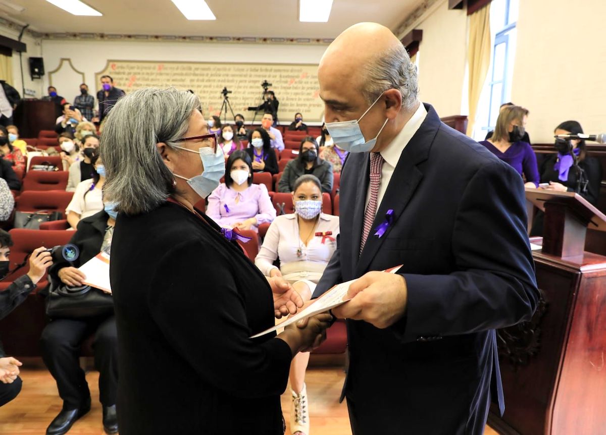 Agregó que la entrega de esta presea representa a todas las mujeres que luchan a diario, especialmente a Maricela Lucio Flores, quien a sus 62 años se ha destacado por colaborar en la organización y participar en redes de vinculación comunitaria como Mujeres Celestes, talleres para replicar conocimientos en materia de elaboración de alimentos saludables, huertos comunitarios, tejido, corte y confección.