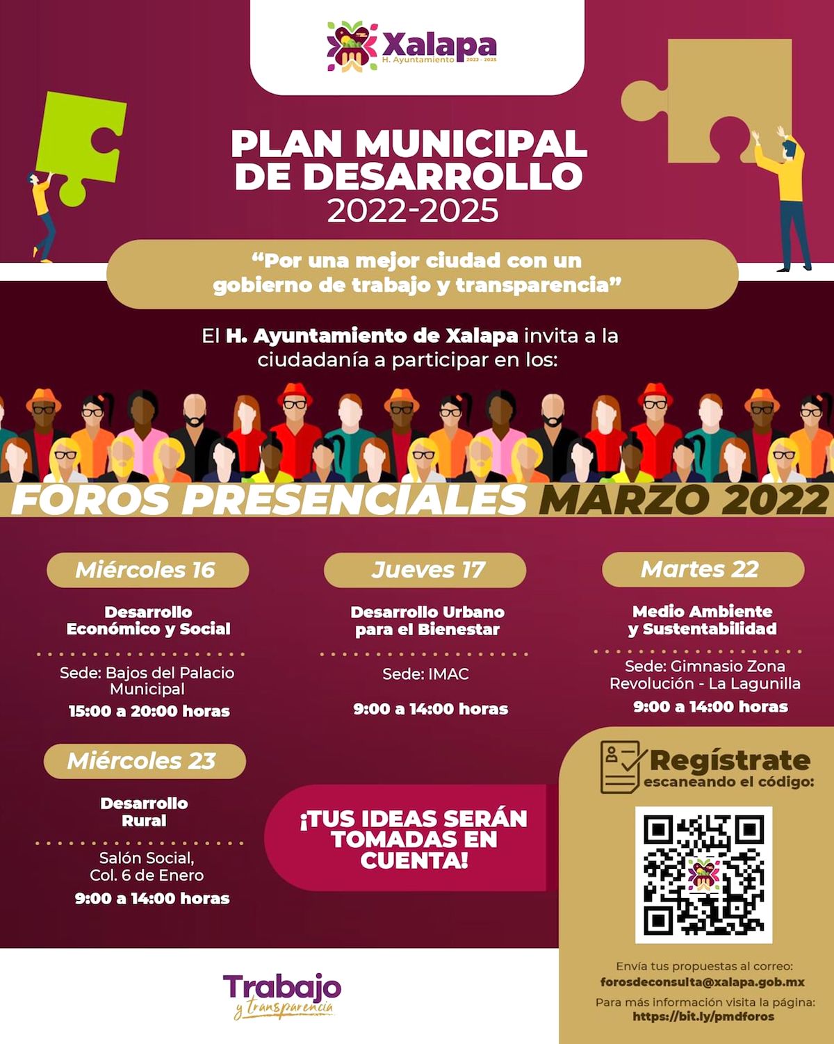 Las propuestas se pueden enviar al correo electrónico forosdeconsulta@xalapa.gob.mx. Para más información se puede visitar el link https://bit.ly/pmdforos.