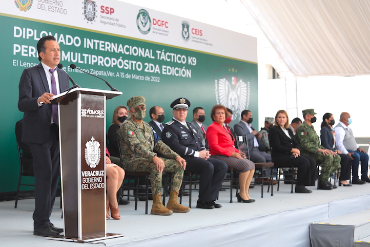 Emiliano Zapata, Ver., 15 de marzo de 2022.- Por segundo año consecutivo, la Secretaría de Seguridad Pública (SSP) imparte el Diplomado Internacional Táctico K9 Perros Multipropósito y ratifica a Veracruz como referente en la formación policial, brindando técnicas de detección de narcóticos, explosivos, búsqueda de personas, guardia y protección, intervenciones terrestres y acuáticas, operaciones aeromóviles y proximidad ciudadana.