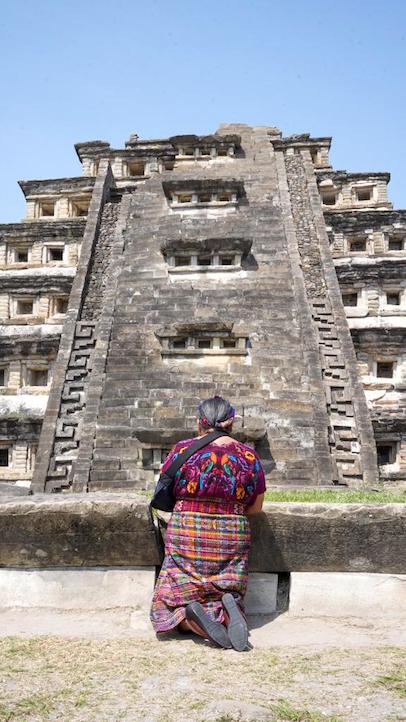La Embajadora de Buena Voluntad por la UNESCO arribó a las 11 de la mañana a la Zona Arqueológica El Tajín donde fue recibida con una ceremonia en el Kantiyán, acompañada por el presidente del Consejo Supremo Totonaco, Gerardo Cruz Espinosa, y la secretaría de Turismo y Cultura, Xochitl Arbesú Lago.
