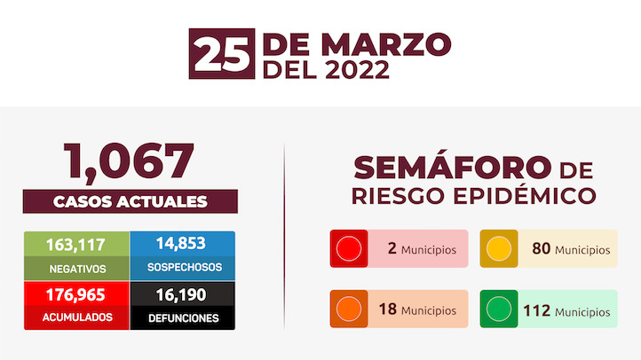 Xalapa, Ver., 25 de marzo de 2022.- La Secretaría de Salud (SS) da a conocer que, en las últimas 24 horas, Veracruz sumó 176 mil 965 (+ 110 nuevos) casos confirmados de COVID-19, luego de 354 mil 935 estudios practicados.