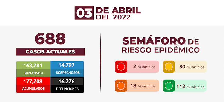 Hay 688 positivos y 105 sospechosos activos, al tiempo que van 160 mil 748 pacientes recuperados y permanecen en vigilancia 684.