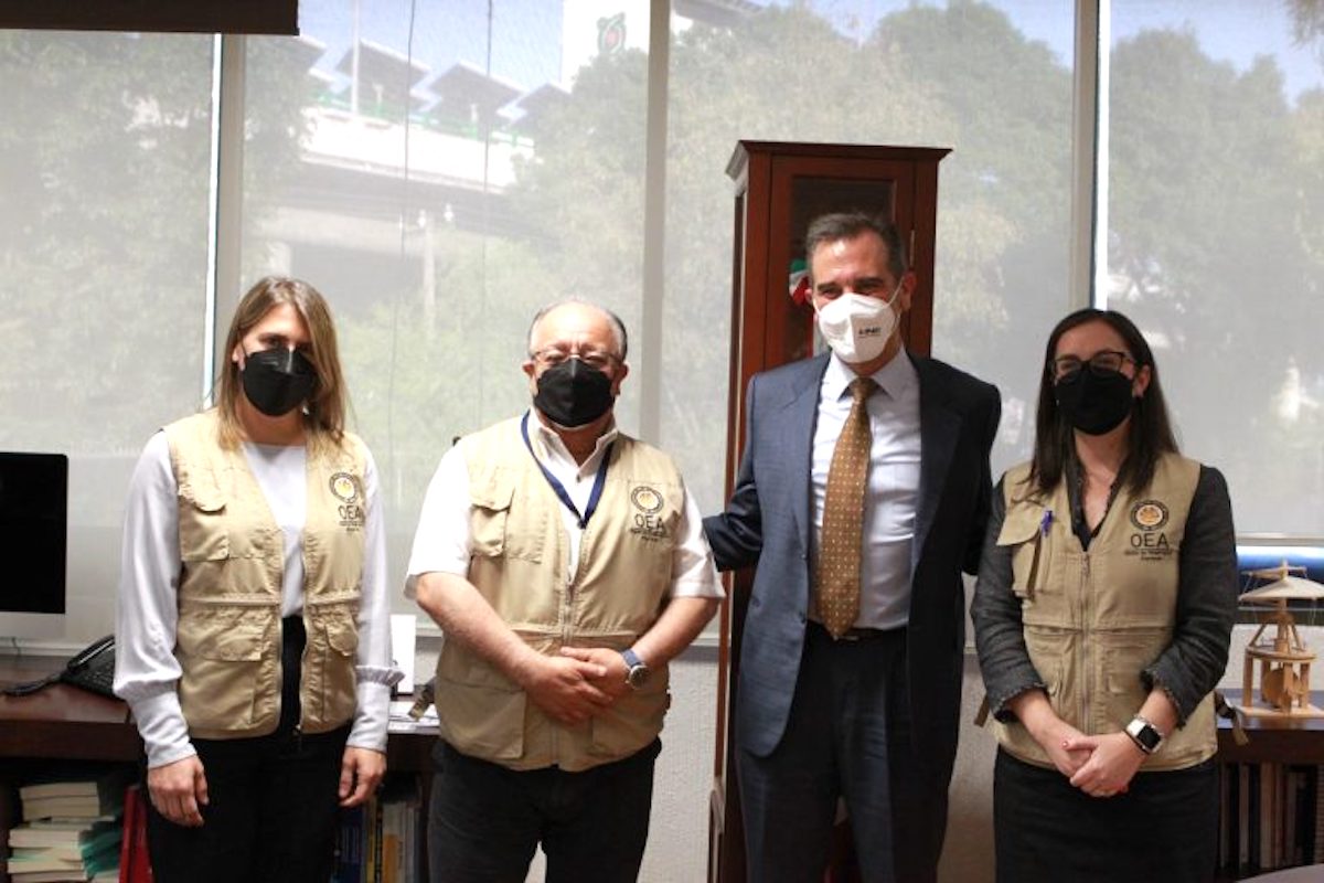 Ciudad de México, 05 de abril de 2022.- El Consejero Presidente del Instituto Nacional Electoral (INE), Lorenzo Córdova Vianello, se reunió con el Jefe de la Misión de Visitantes Extranjeros de la Organización de los Estados Americanos (OEA), Fernando Tuesta; la Jefa de la Sección de Observación Electoral de este organismo, Brenda Santamaría y la Subjefa de la Misión, Yerutí Méndez.